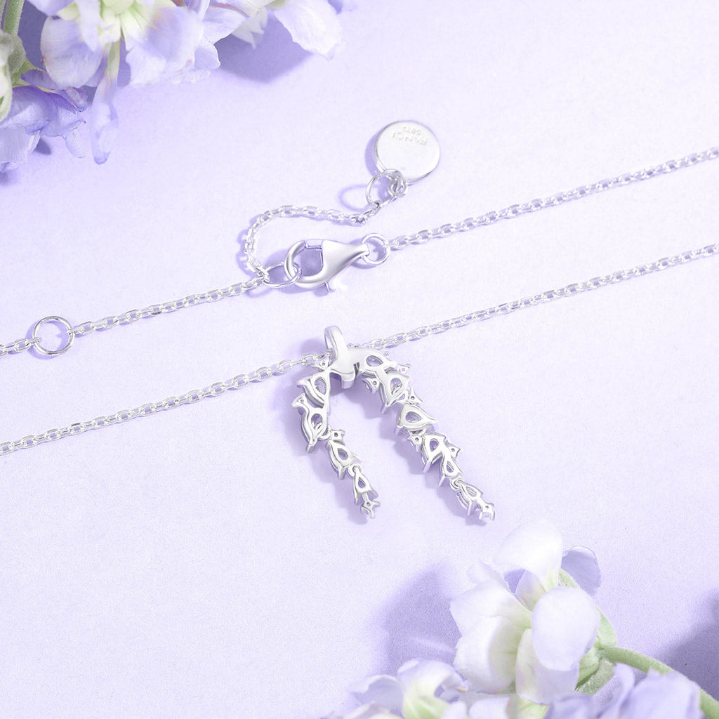 Our "Blooming Wisteria" long drop pendant necklace captures the stunning beauty of wisteria flowers in full bloom with its elegant white and light purple stones. This design embodies the romance and deep connections that wisteria symbolizes, reflecting enduring bonds and growth in each intricately arranged piece.
