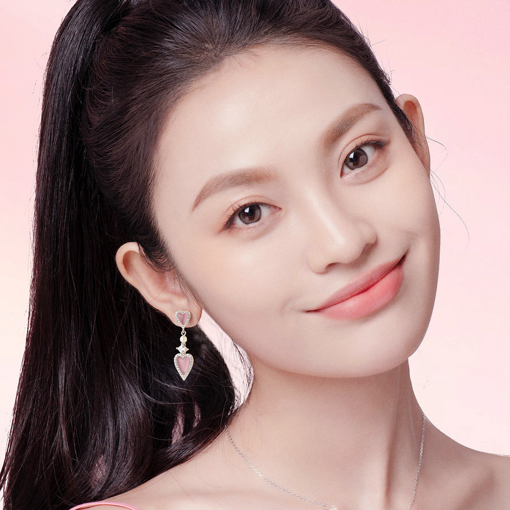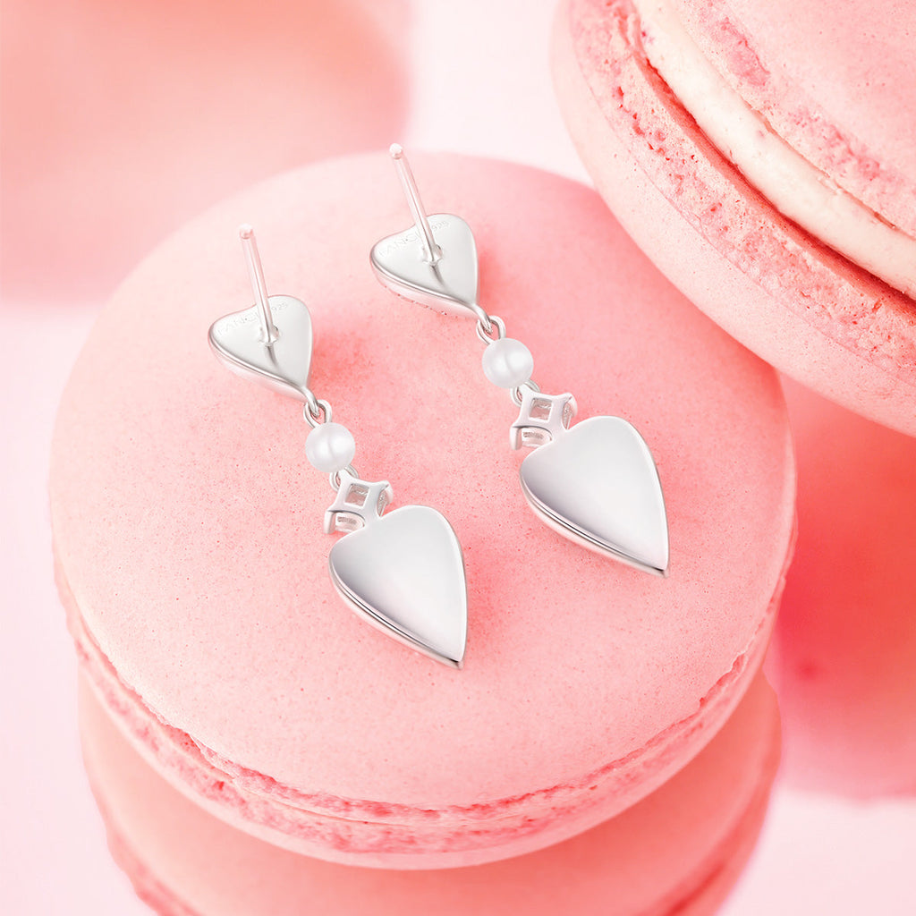 FANCI "Pink Moment" Pink Heart Long Drop Sterling Silver Earrings With White Pearl and CZ Stones