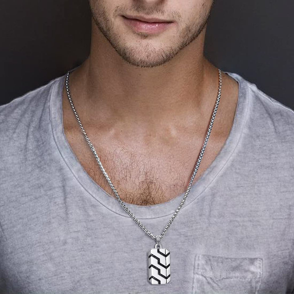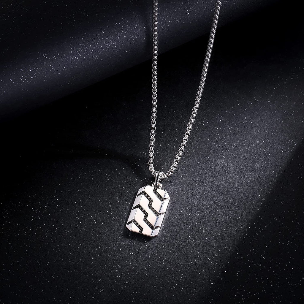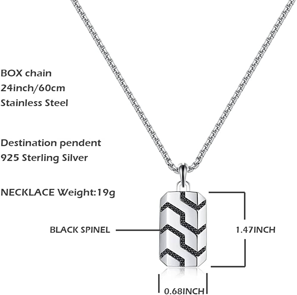 Sterling Silver Mens Black Spinel Classic Chain Dog Tag Pendant On A Stainless Box Chain Necklace 24 Inches