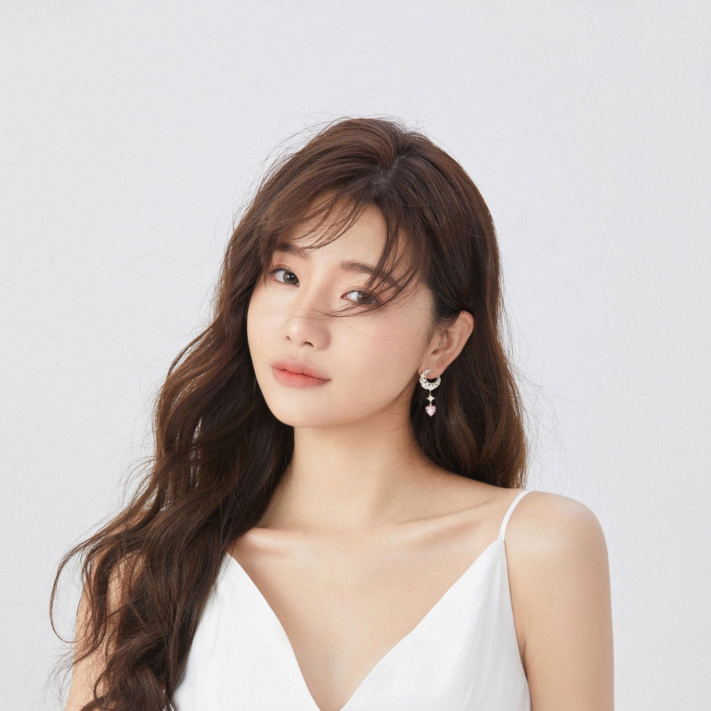 Shine like a star in the night sky, with a paved dazzling crescent and a pink true heart in the center. Find its matching necklace for a full look.